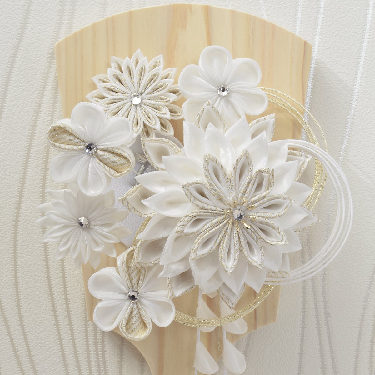 花をモチーフに白系でまとめた「正絹つまみ細工」。