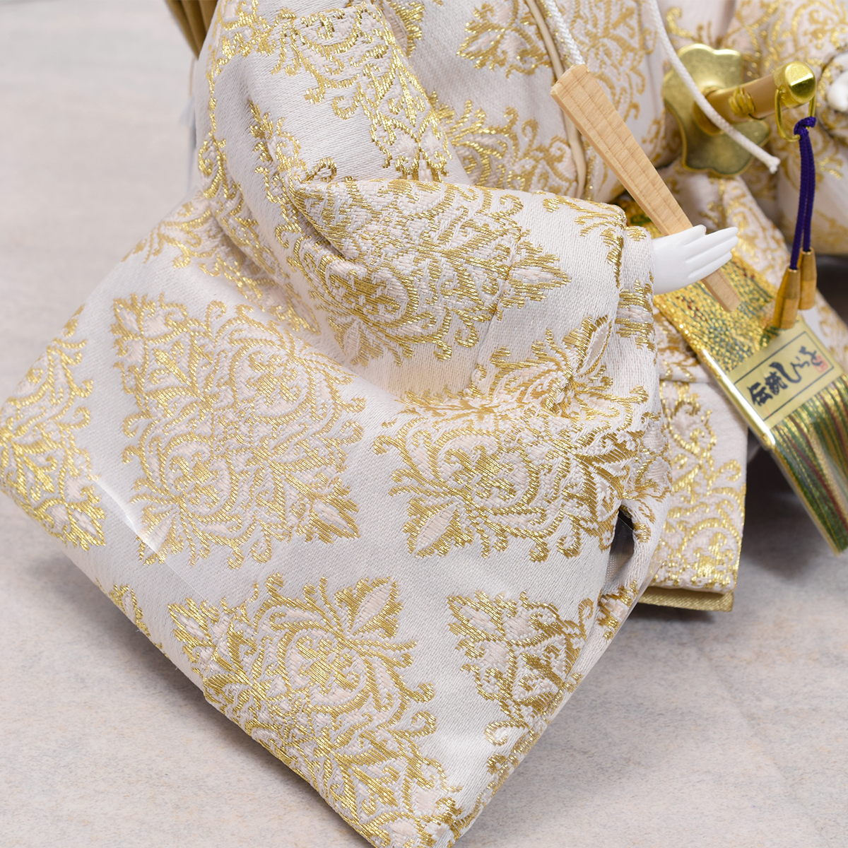 御衣裳の白色の生地は金糸銀糸を織り込んだ京都西陣織金襴。