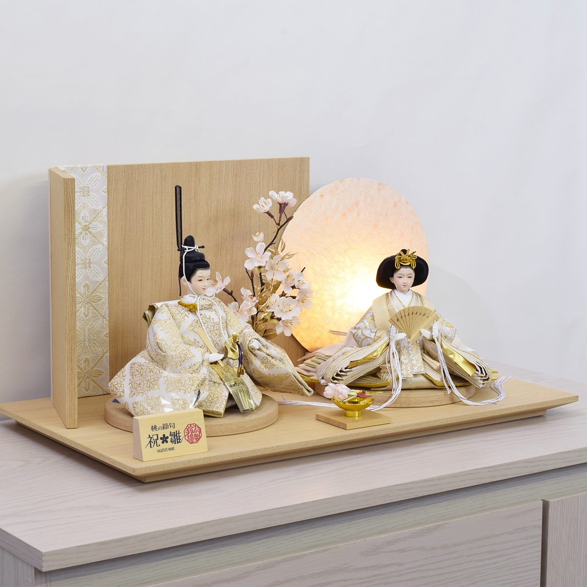 親王揃い・木目御飾台・木目丸形親王台(対)・木製突板・帯地貼二曲屏風