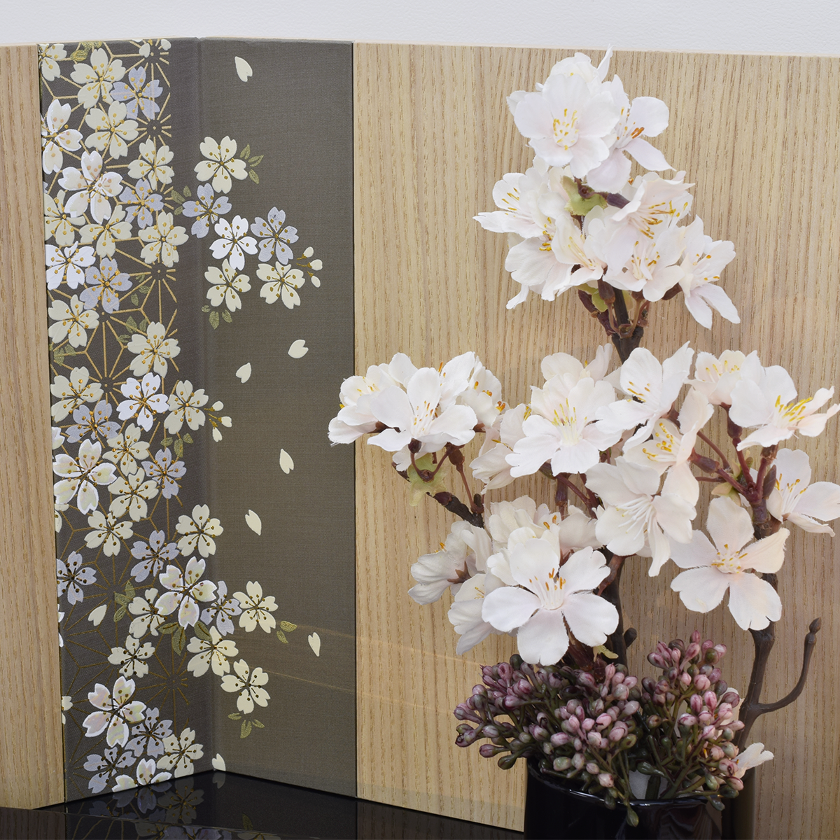 御屏風は木目突板に金彩桜の図を嵌め込んだ二曲屏風。