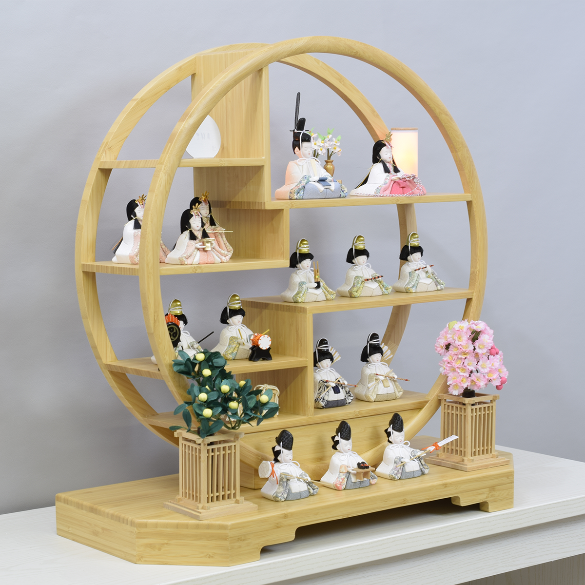 15人揃い・丸型竹製台・円型行灯(対)・三宝・貝桶(対)・桜橘