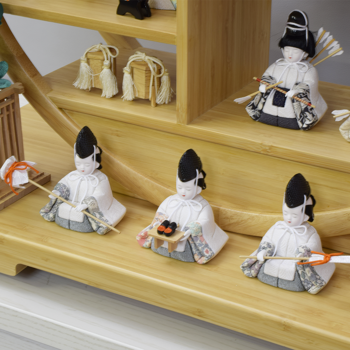 コンパクトサイズで飾れる木目込み人形の15人、総揃いのセットです。