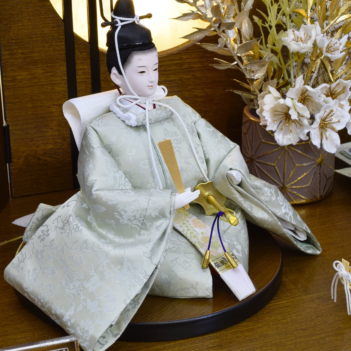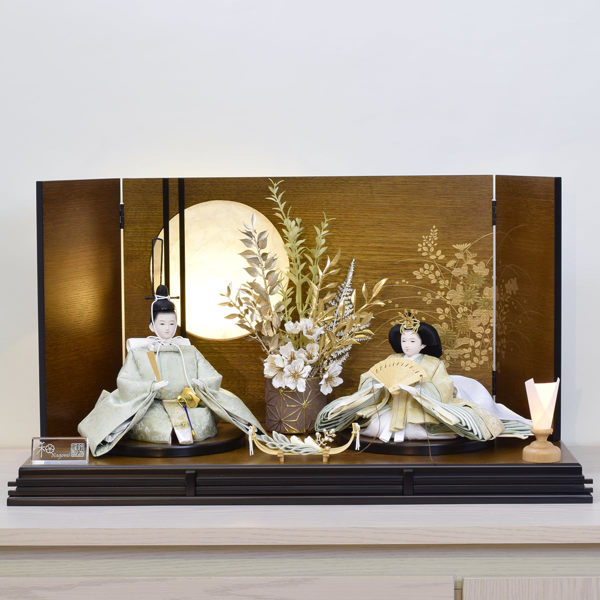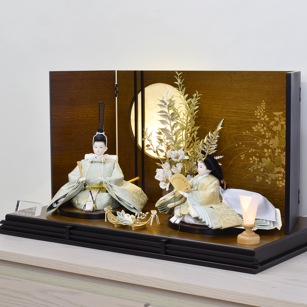 親王揃い・木目台・屏風(LED付き)・丸形親王台(対)・床型燭台(1)
