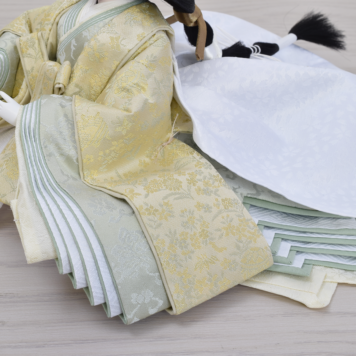 五衣(重ねの着物)の裾は額縁仕立てで仕立てた大変手間の掛かる技法を取り入れています。