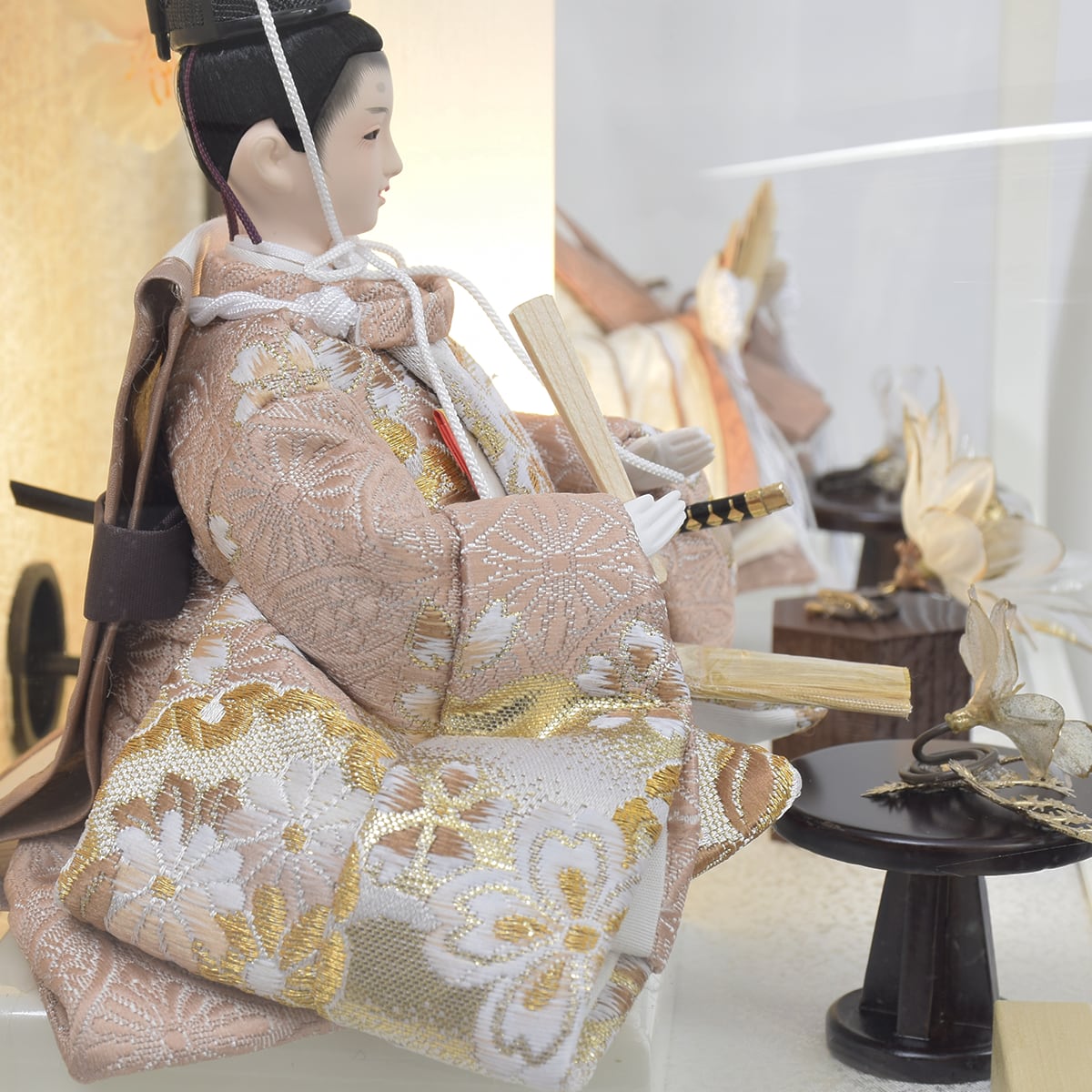 御人形のお着物は段織を採用した裾模様仕立。袖口に柄が出る様特別に織り上げた生地を使用した、おしゃれな衣装です。