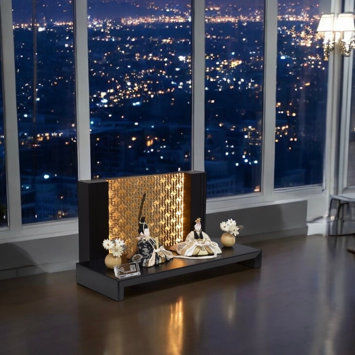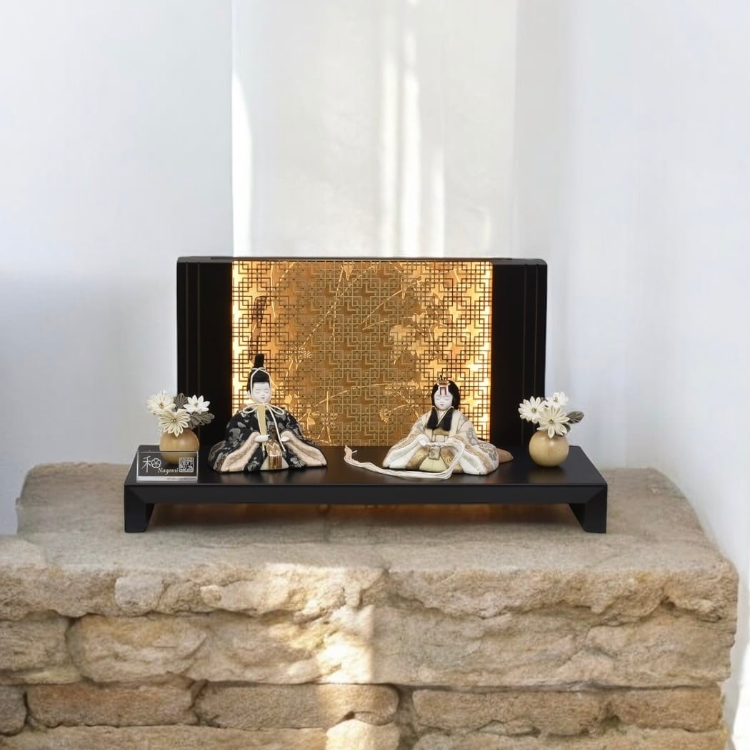 親王揃・木製平飾台・LED内蔵衝立(電気コード式)・花飾り(対)