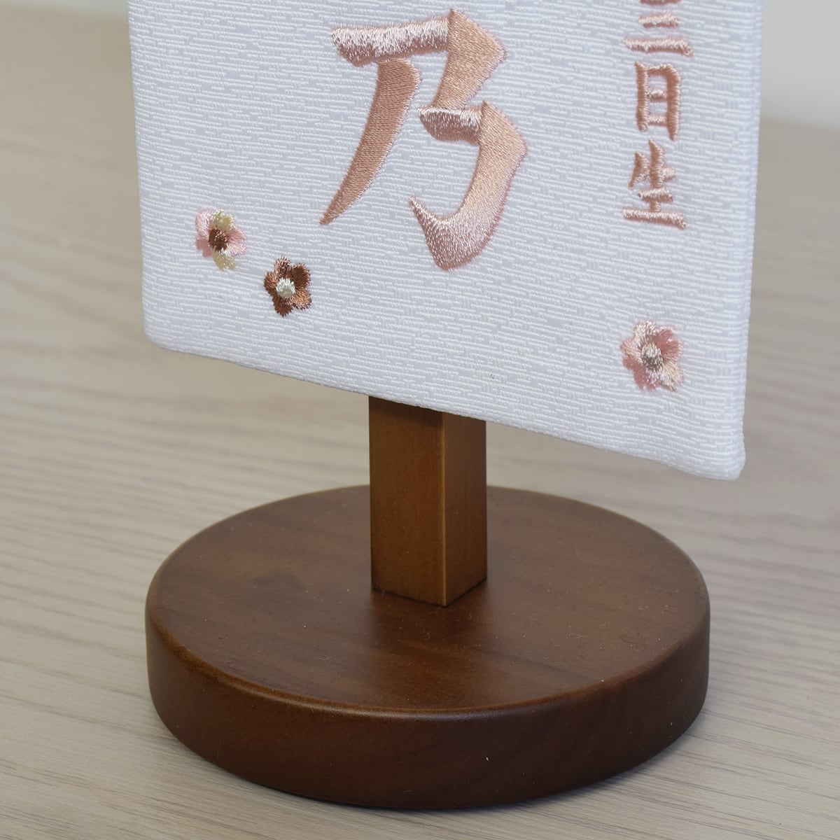 御飾台は木製でナチュラルな雰囲気に馴染む名前旗です。