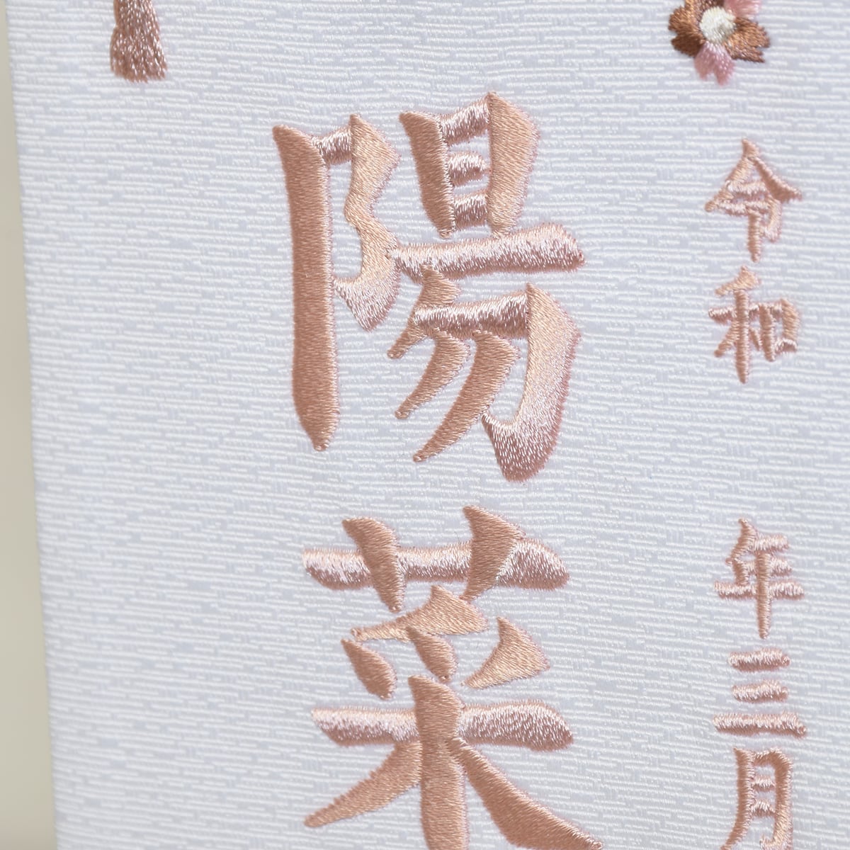 白地の生地に「つるし飾り」をモチーフにした絵柄を刺繍いたしました。