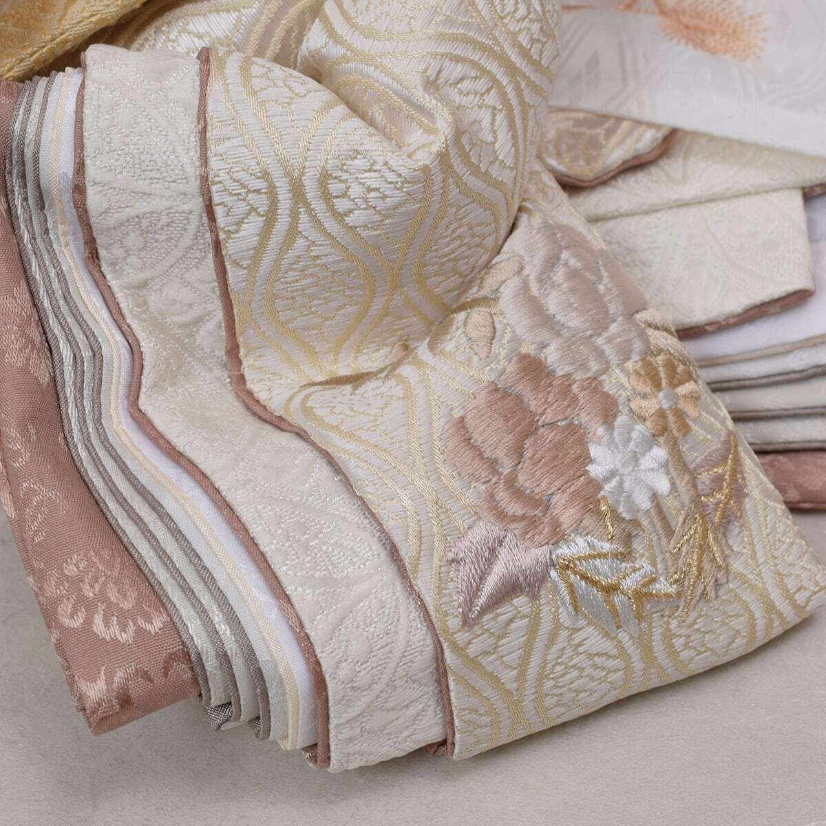 御殿様と御姫様の衣裳は「立涌文様」の西陣織金襴地に牡丹、菊、藤などの花柄の刺繍を施した淡い色目の御衣裳を着せてけました。