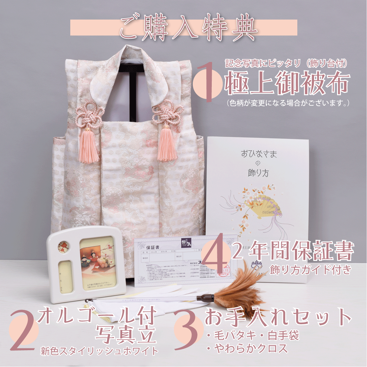 御被布(柄が変わる場合がございます)・お手入れセット(毛ばたき・白手袋・クロス)・オルゴール付写真立・2年間保証書