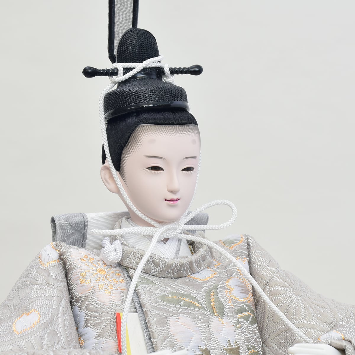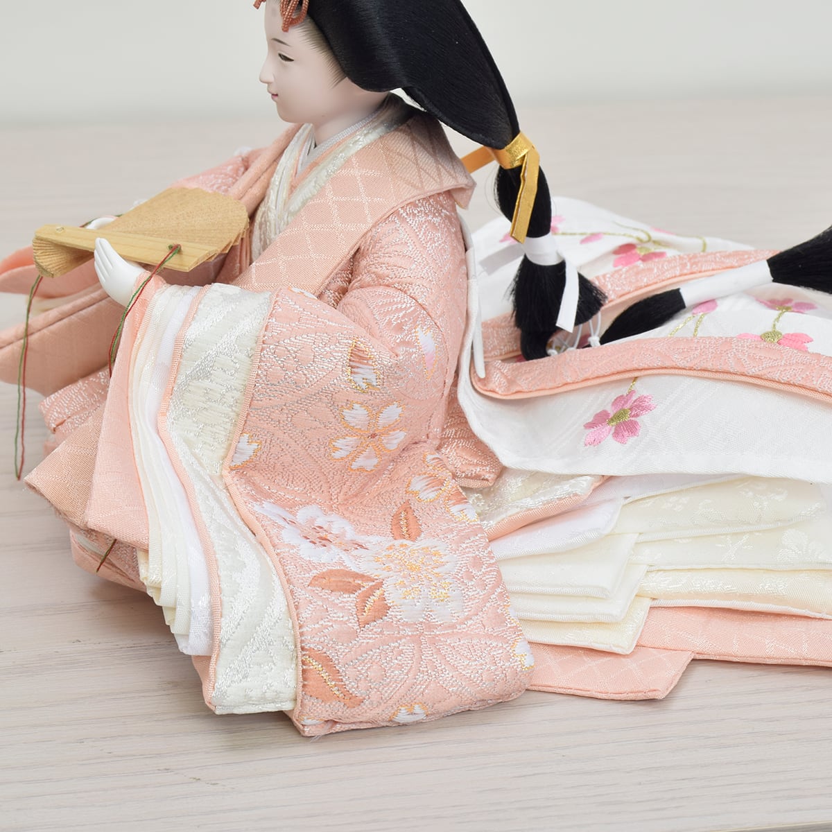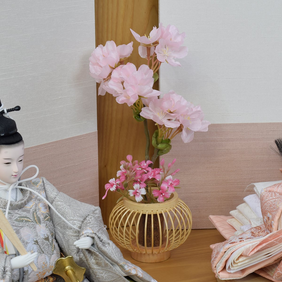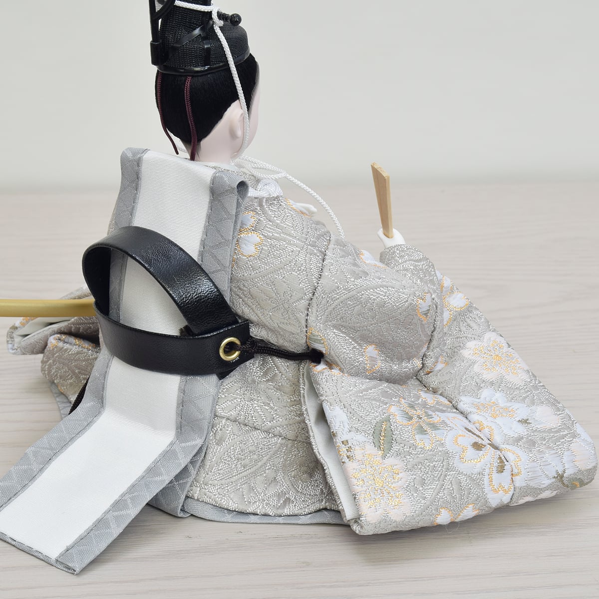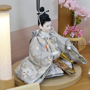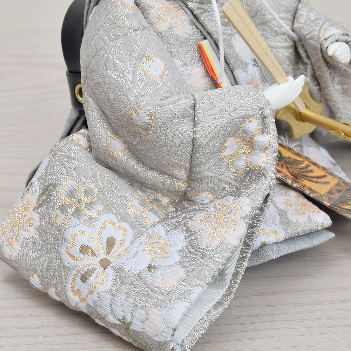 お人形の衣裳は桜柄を織り込んだ西陣織金襴を使用。