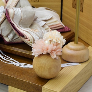 前飾りには木製の行器と左右にはアレンジフラワーを配しました。