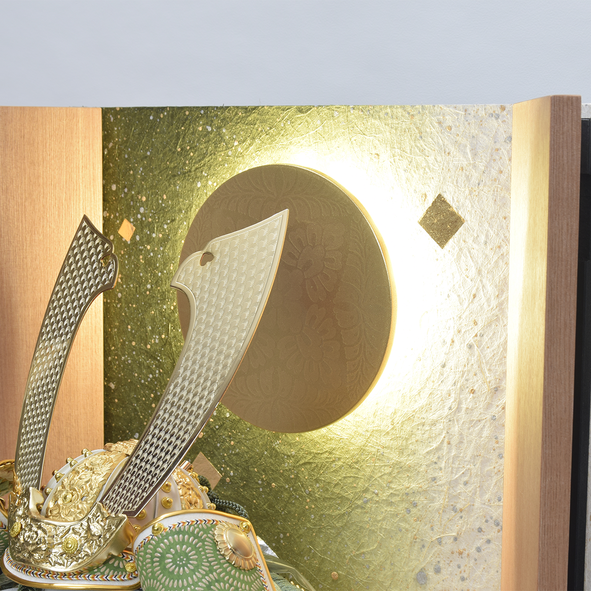 おしゃれなLEDライト内臓のお屏風がセットされた兜飾りの登場です。