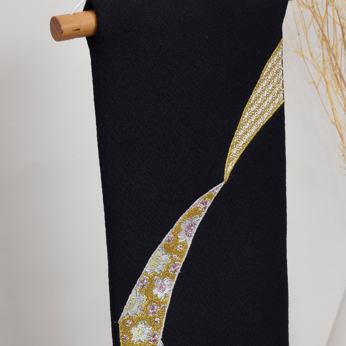 刺繍入りの背景のタペストリーは黒地に七宝柄のお洒落なデザイン。