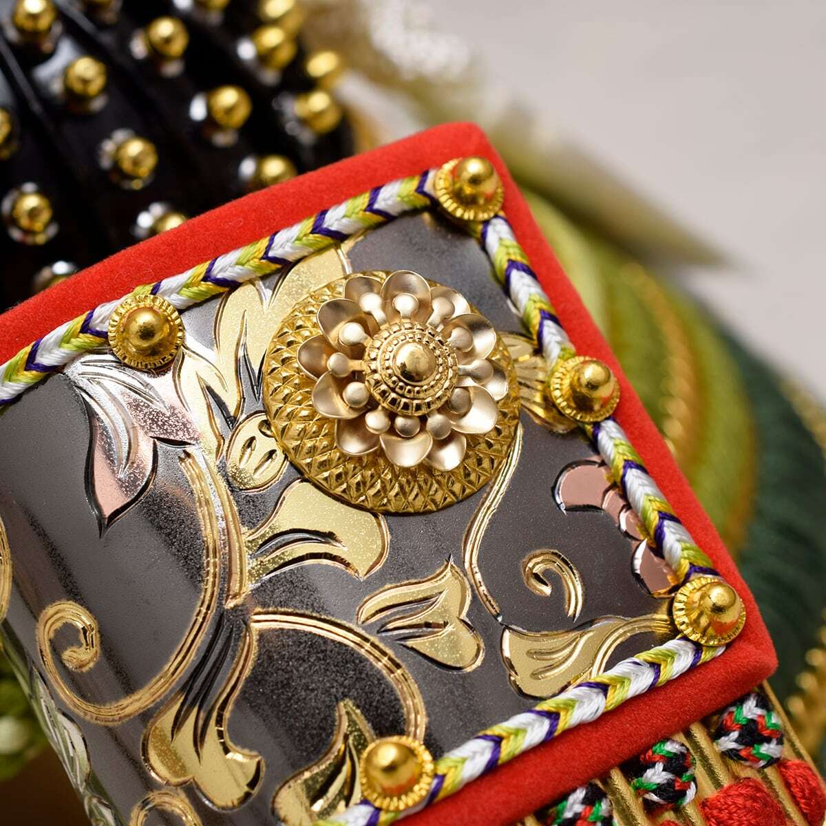 鍬形台と吹き返しには立体的で美しい花型の飾り金具。