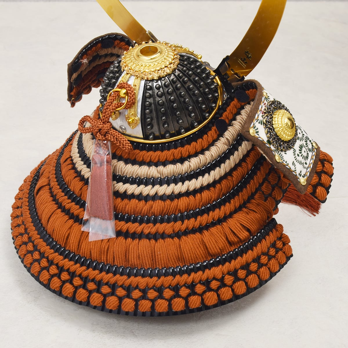 赤煉瓦を思わせる深みのある真朱の糸で威し、温かみと力強さを併せ持つ色調に仕上げました。 室町時代の笠じころを基にした造形美が際立ち、伝統の技と現代感覚が調和した上質な兜飾りです。