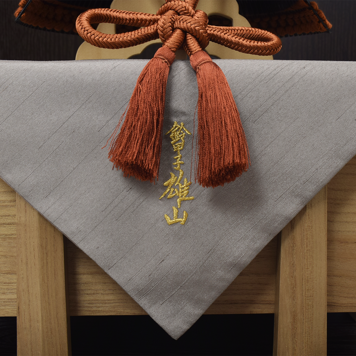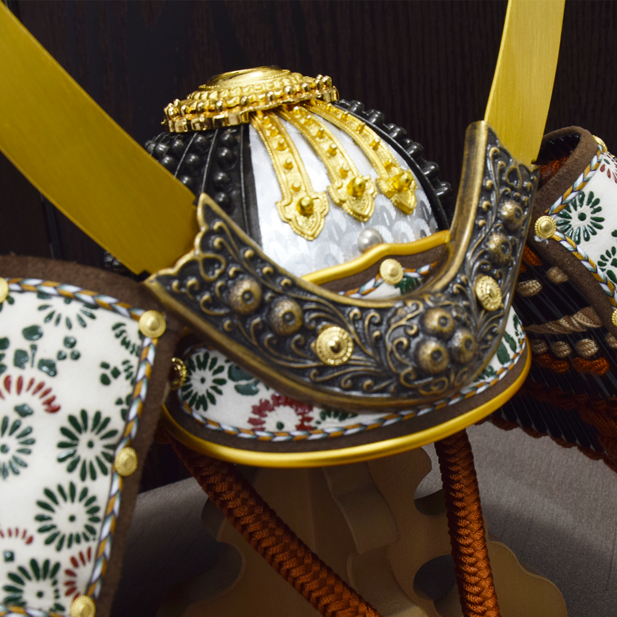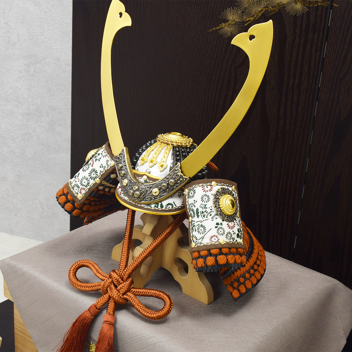 節句人形として文化が隆盛した近代のデザイン的な鍬形、そして図柄の色使いと兜を載せる芯木に現代的な特徴を持たせました。