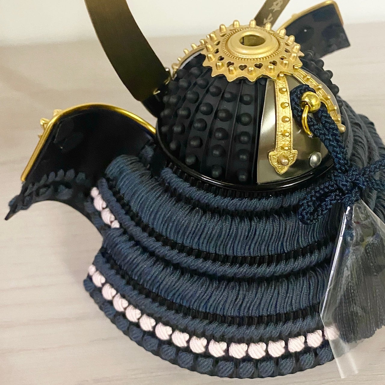 お飾り台は兜が収納できるツートンカラー木製箱。