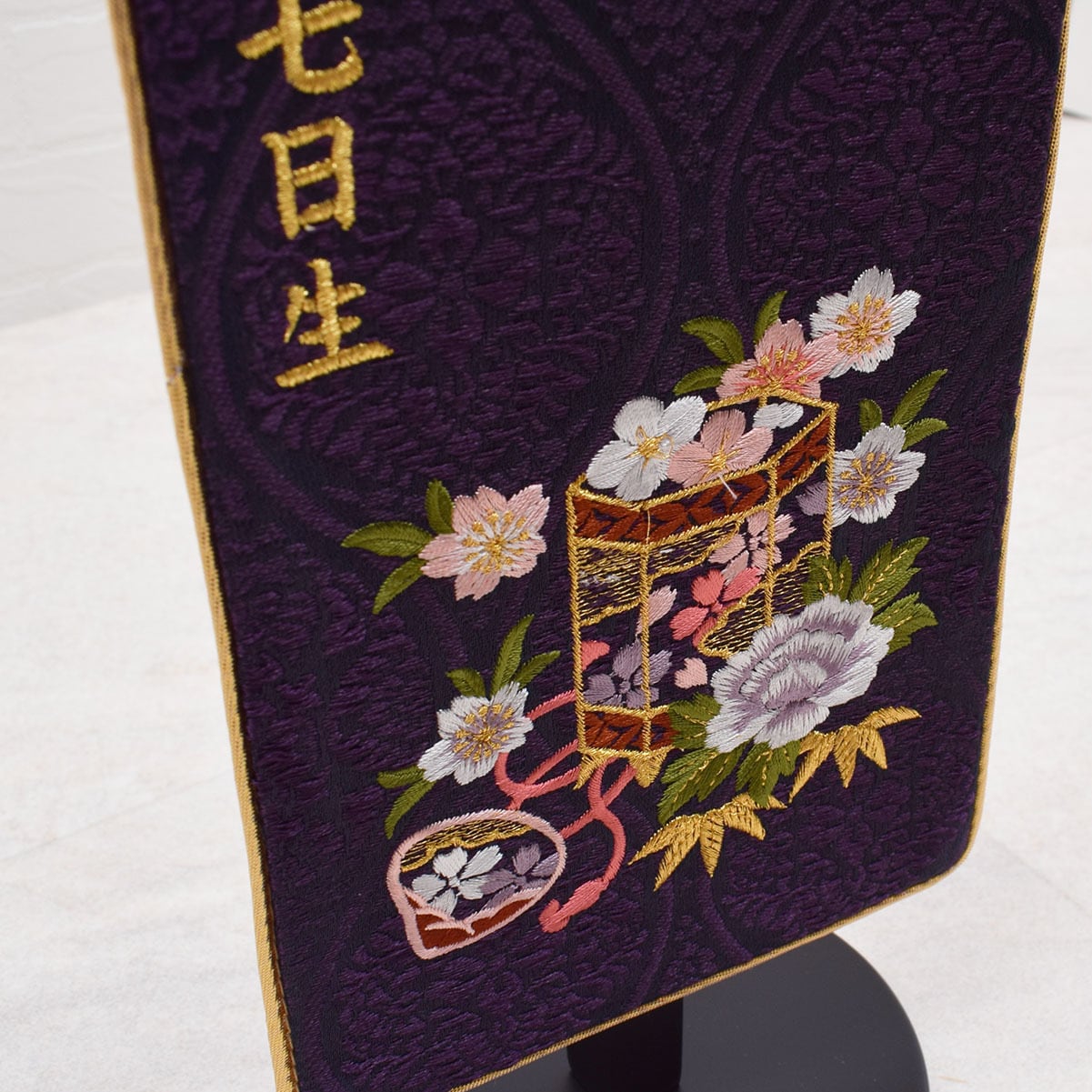 【紫立涌】には貝桶に桜、牡丹の柄を刺繍いたしました。