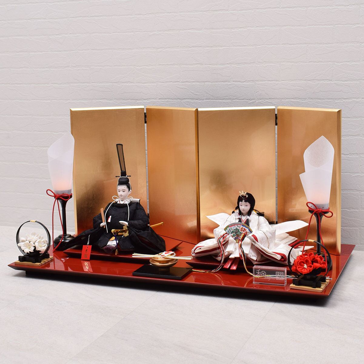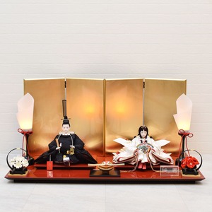 親王揃い・木製赤塗御飾り台・木製赤塗親王台(対)・木製四曲屏風金箔押