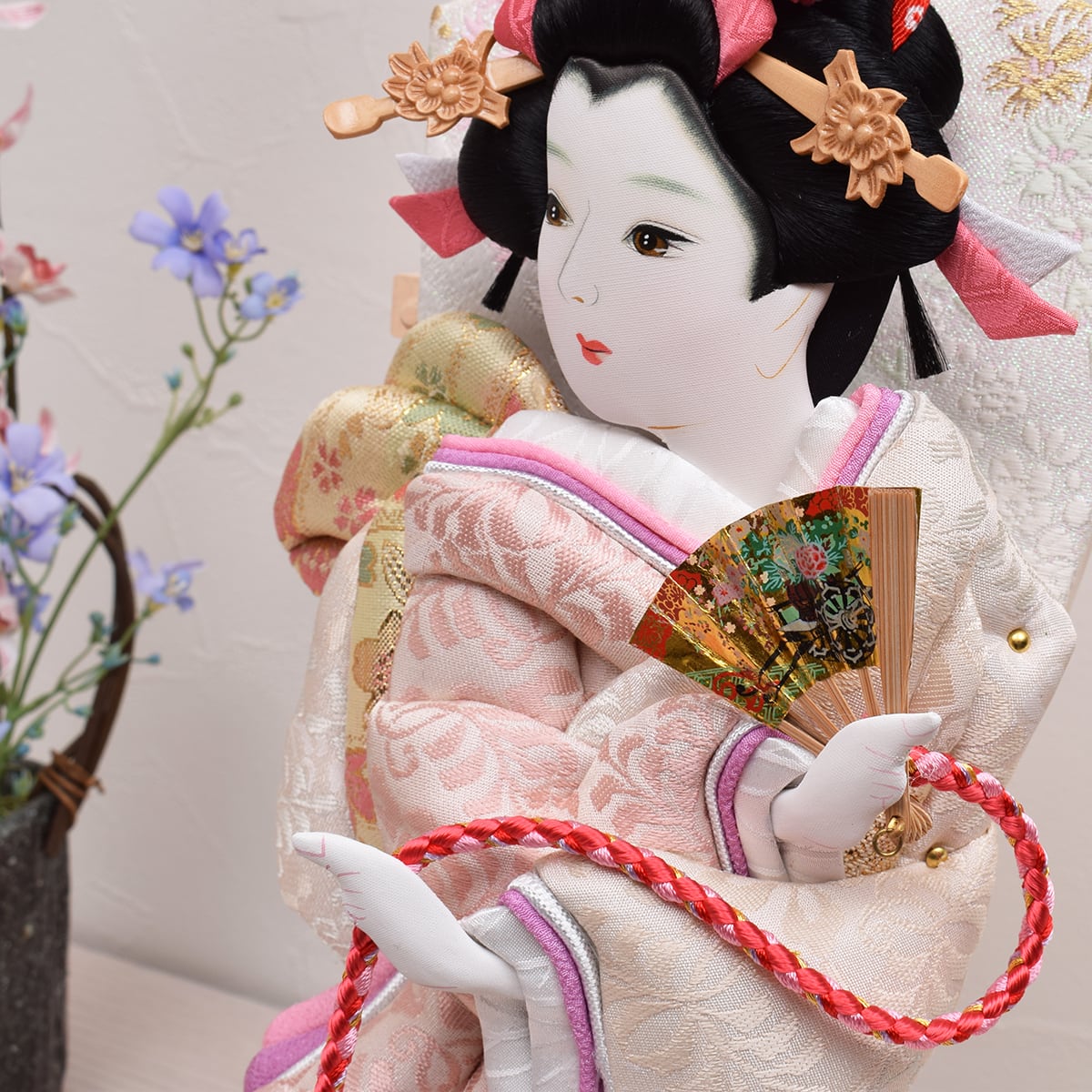 人気の雛人形「和楽」の御人形と同じ配色で設え、