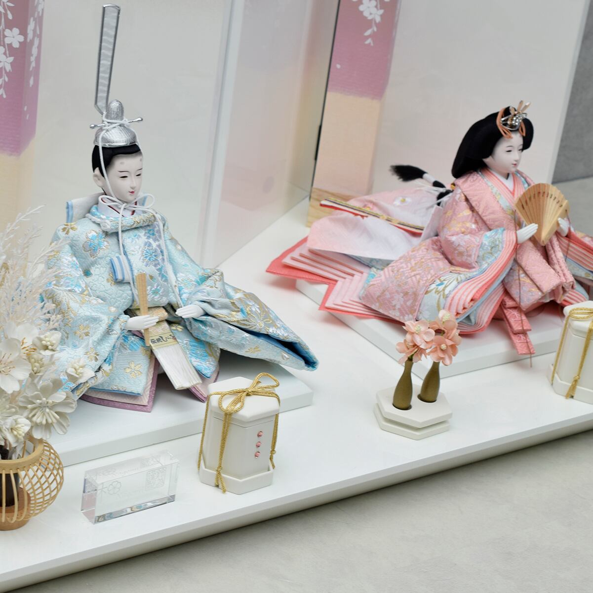 淡いピンク塗りでぼかした御屏風はメタリッの入った美しい色目。お人形を引き立てます。