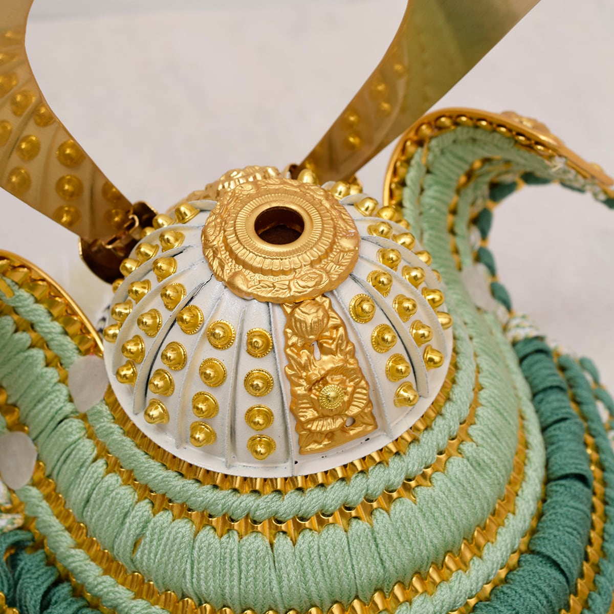 金色金具に緑色のグラデーションの威糸。