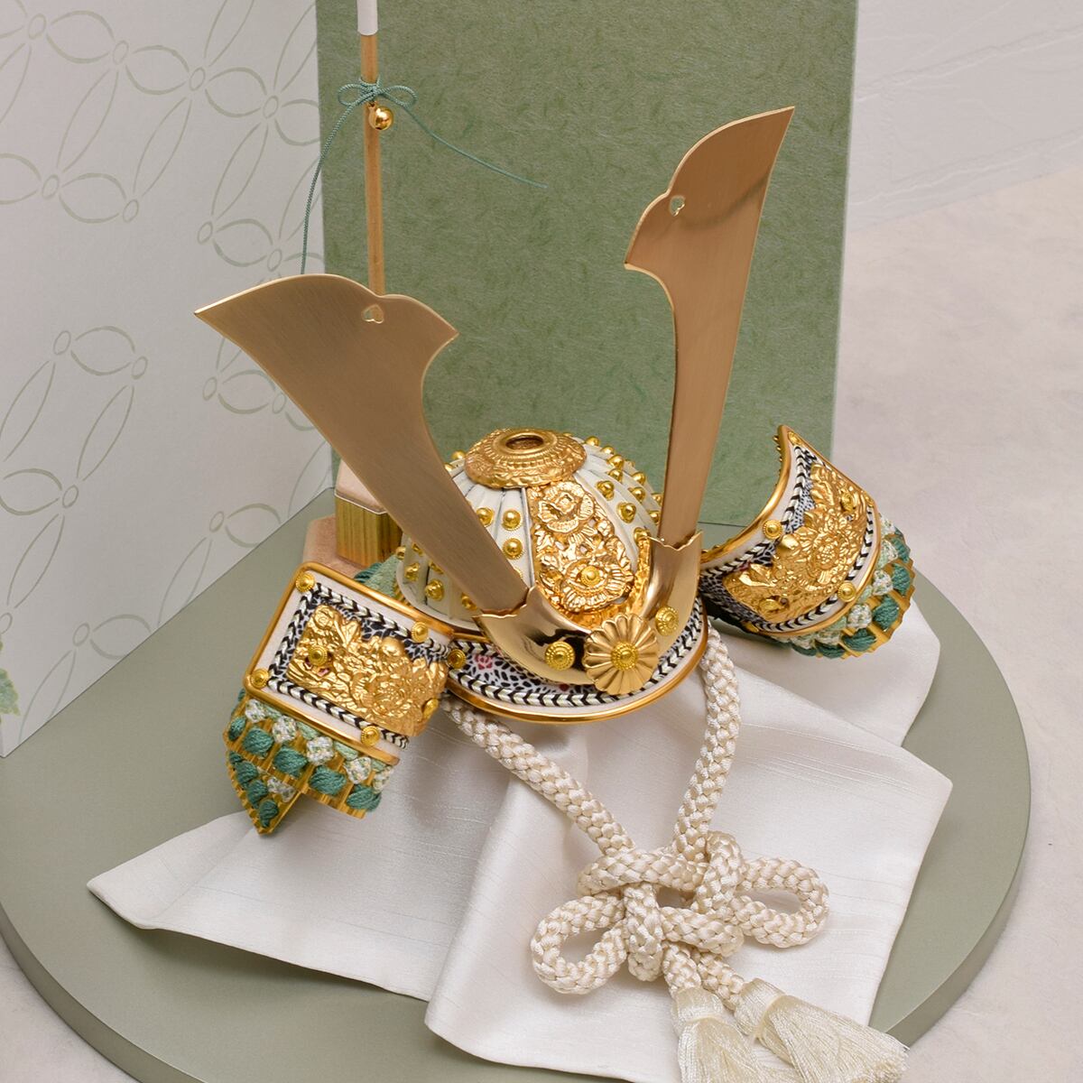 コンパクトな円形御飾台に伝統紋様の御屏風を配したモダンな兜飾りです。