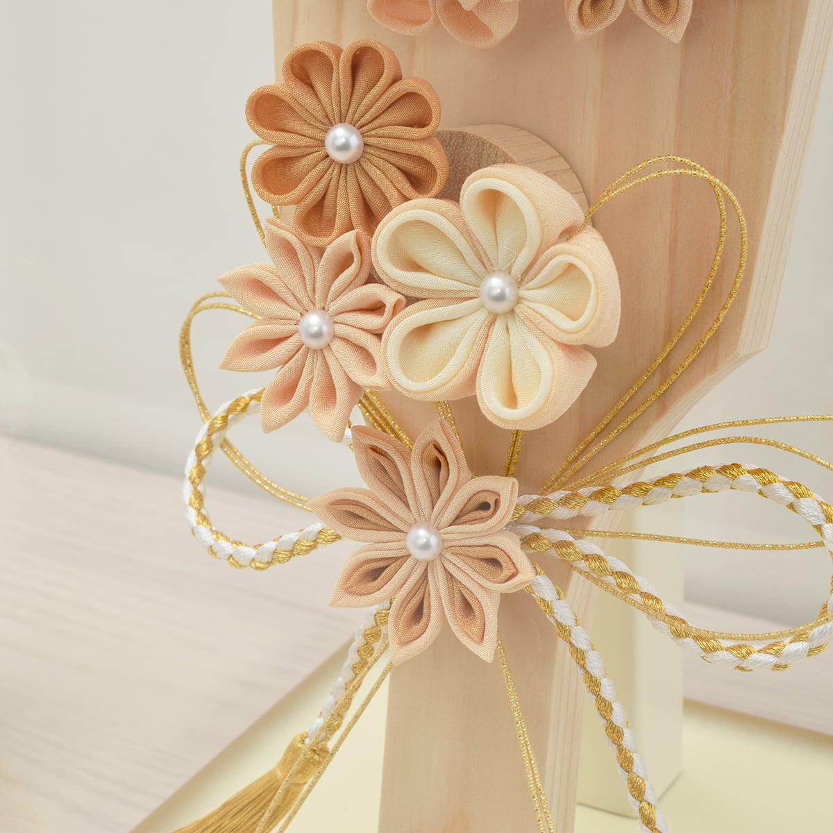 菊、桜、梅、桃などの花をモチーフに栗色系でまとめた「正絹つまみ細工」。