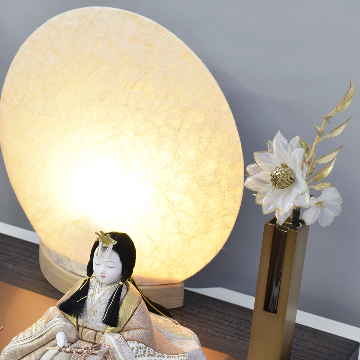 親王揃・木製平飾台・アルミ親王台・和紙行灯・アルミガラス花瓶と花(対)