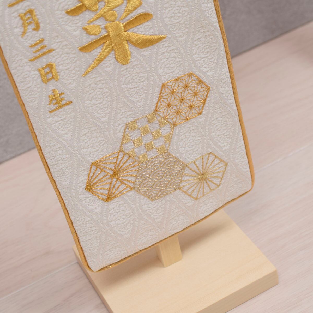 刺繍の絵柄は「亀甲に和柄」をオシャレにデザイン化致しました。