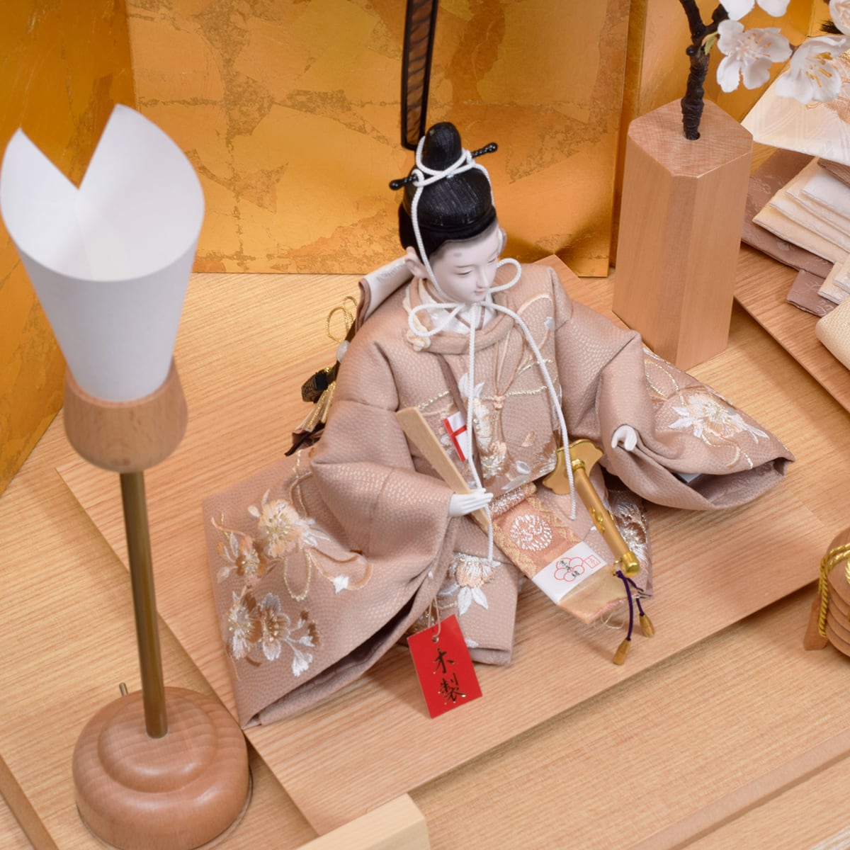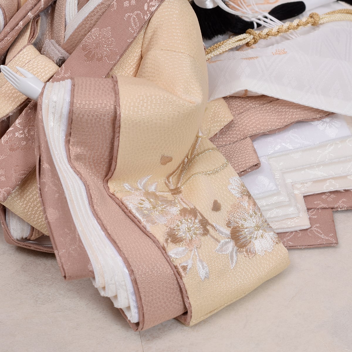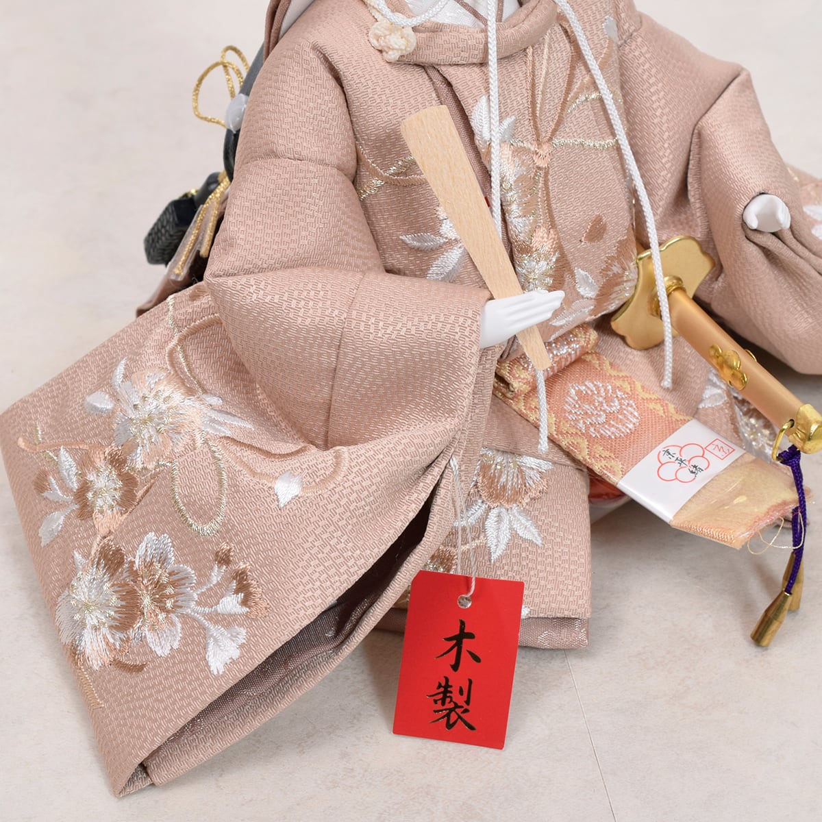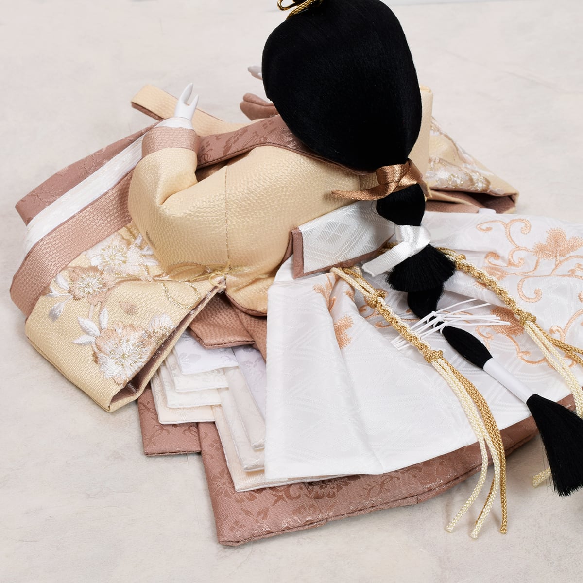 御人形の衣裳は亜麻色やベージュ色で仕立てナチュラルな雰囲気に仕上げました。