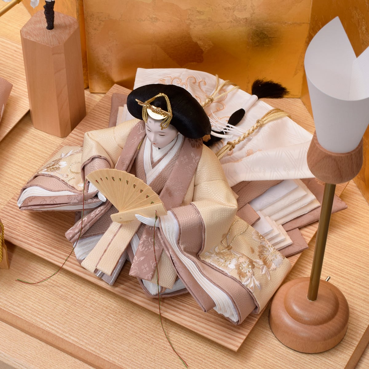親王揃い・LED内蔵木製飾り台(収納箱)・四曲屏風・木製燭台一対(LED電池式)・三方・花飾り(対)