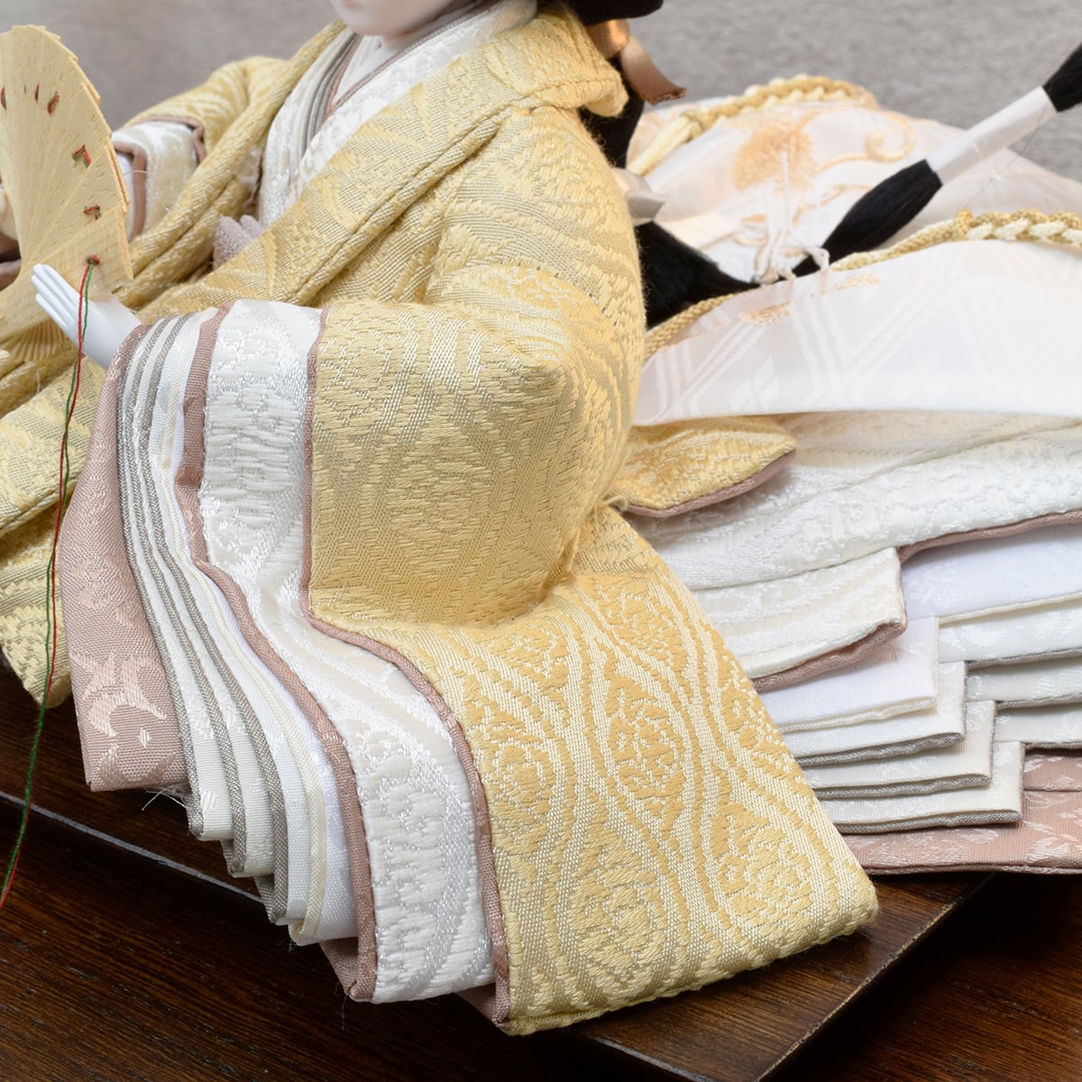 お人形の衣裳は正絹西陣織金襴「立涌紋様】を用い仕立てました。