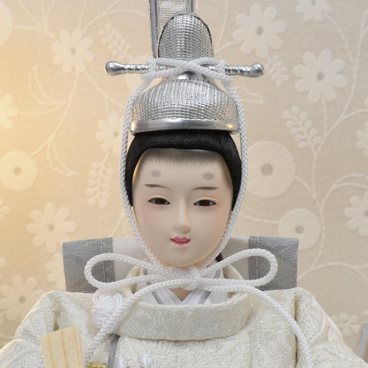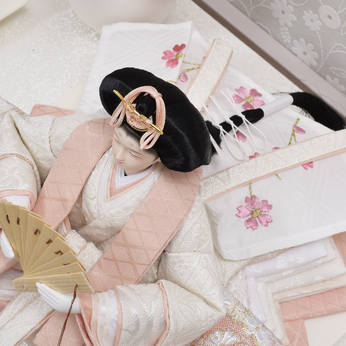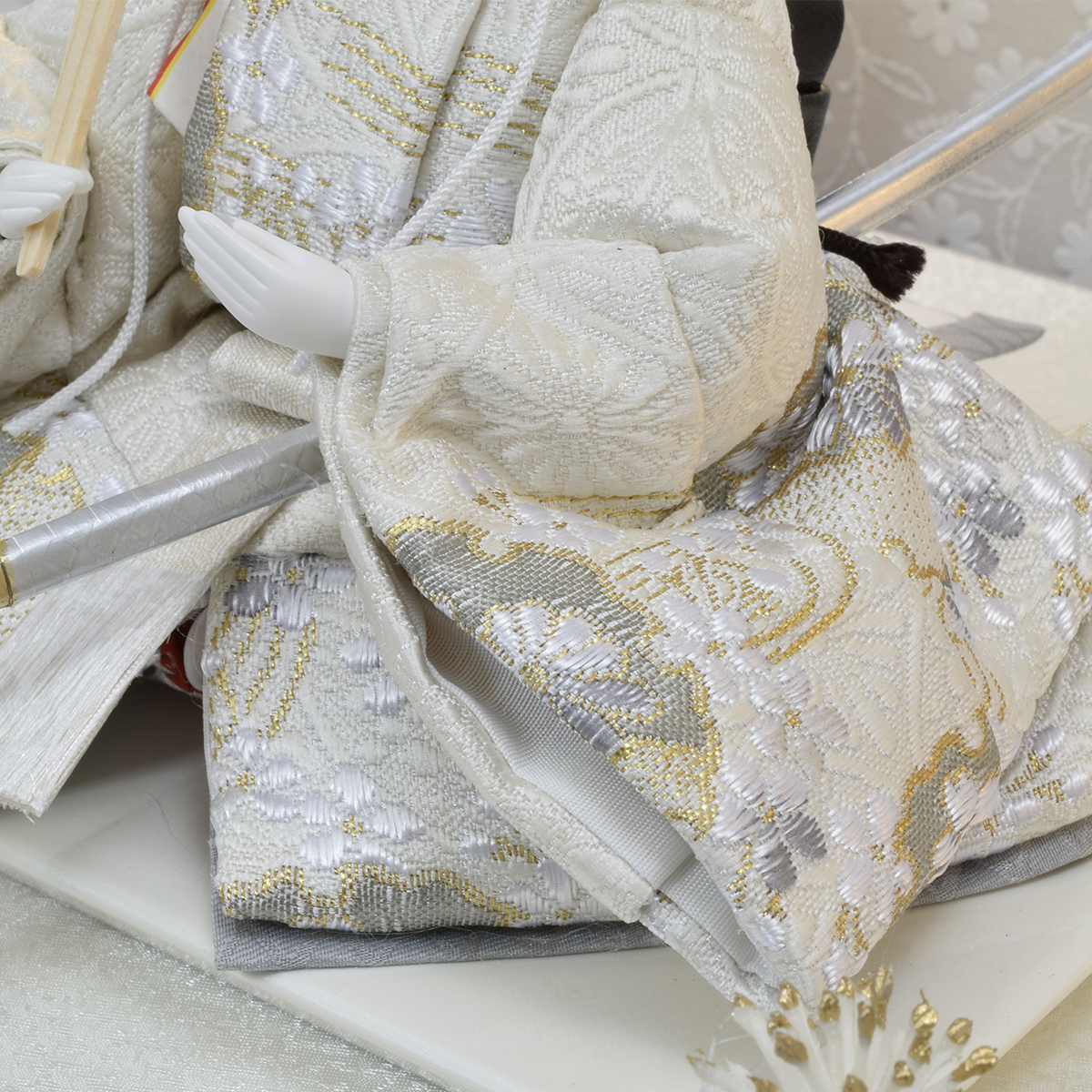 お人形の衣裳は白地に雪輪柄の西陣織金襴を用い仕立てました。