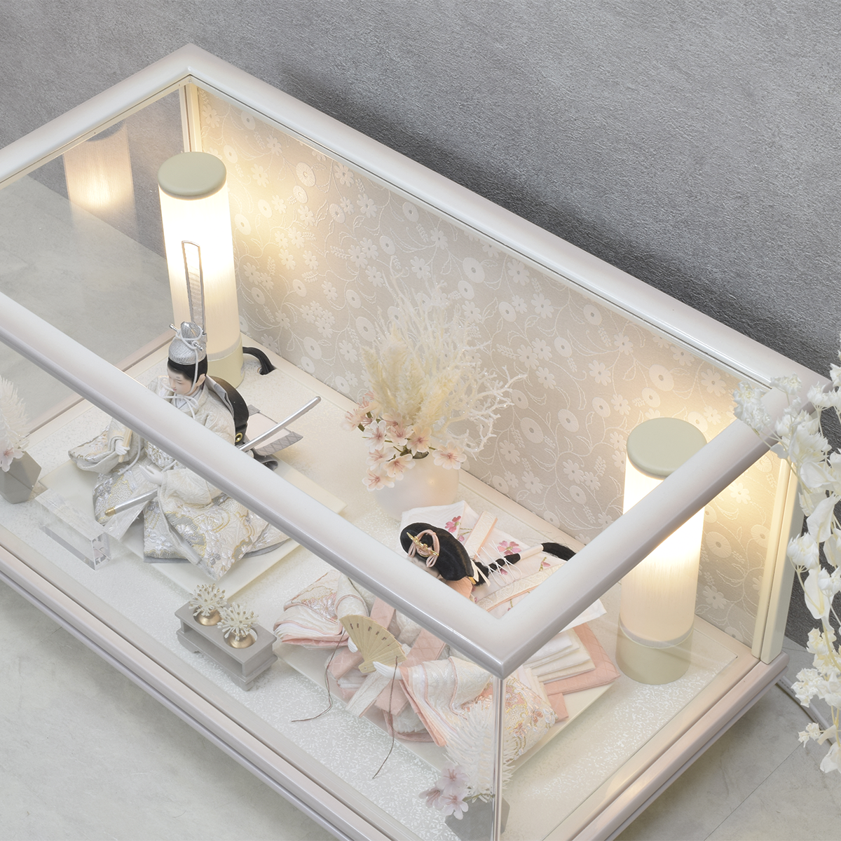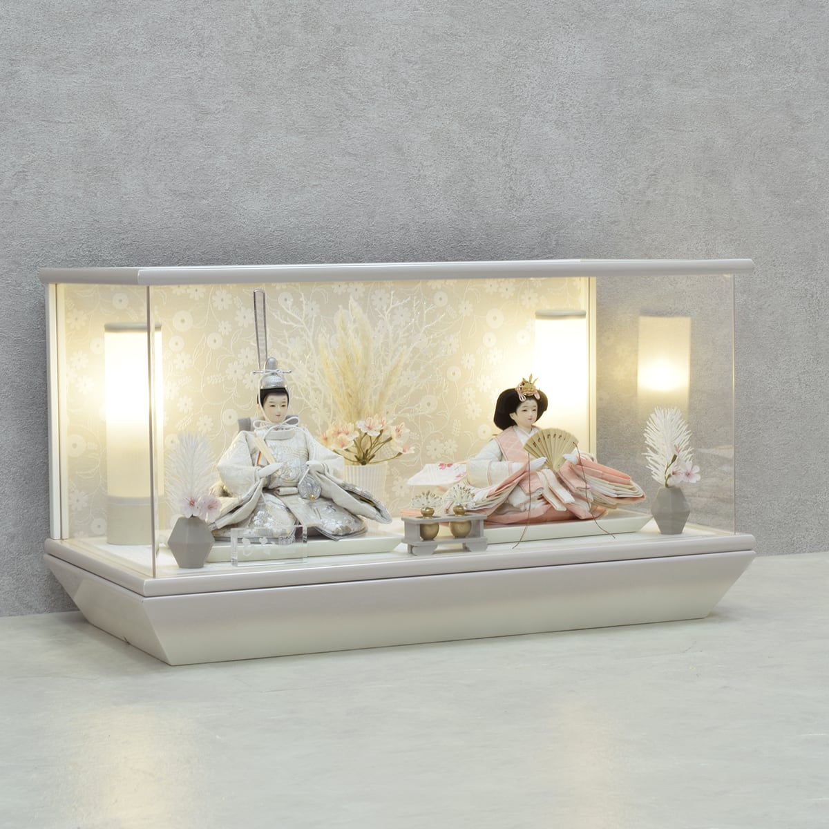 スタイリッシュなアクリルケースに収められた、雛人形です。